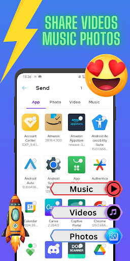 Easily send movies, photos, videos, music, installed apps, APKs, folders, and more.