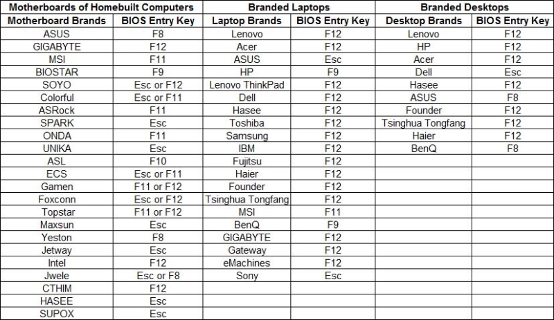 If you still can't enter BIOS after doing that, please try pressing another key. Each brand of laptop, desktop and motherboard have different BIOS entry keys. Please view the right-side table to find your own laptop, desktop or motherboard.